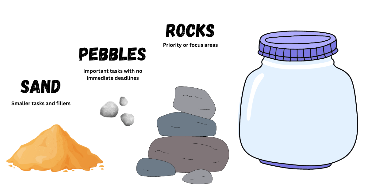 Du hast einen Krug. Du hast große Steine, Kieselsteine und Sand, um ihn zu füllen. Wenn du mit dem Sand und den Kieselsteinen anfängst, hast du keinen Platz mehr für die großen Steine. Und diese großen Steine? Sie sind deine großen Prioritäten.