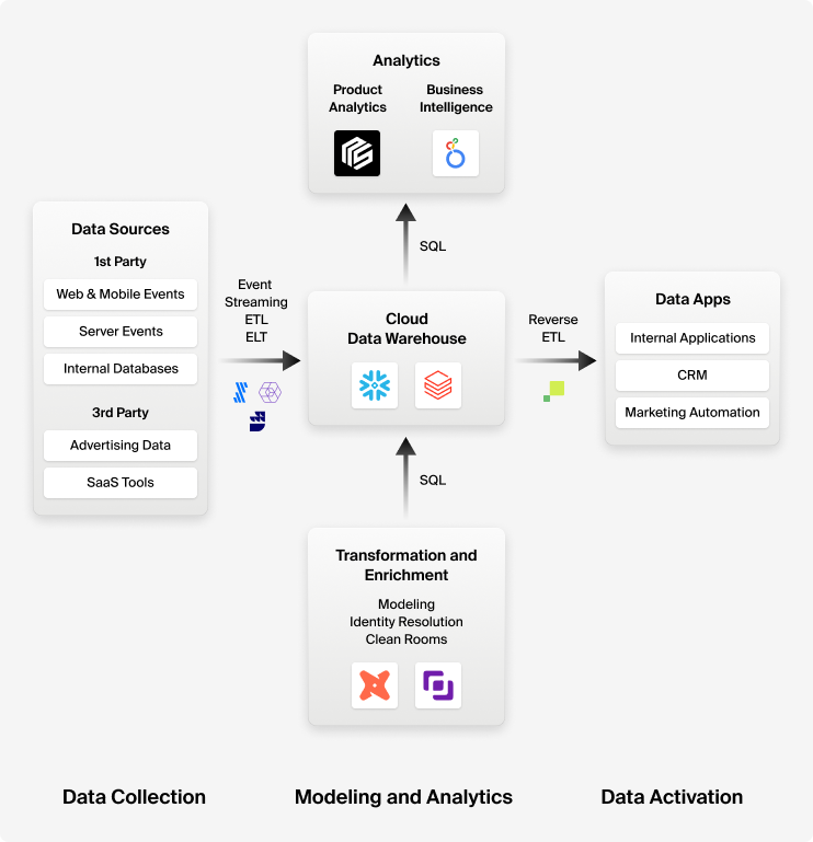- Datenerfassung: Ziehen Sie Instrumentierungsdaten aus Segment, Snowplow oder Rudderstack zusammen mit Geschäftsdaten aus Ihren Anwendungsdatenbanken oder SaaS-Tools von Drittanbietern mit Fivetran. Legen Sie all diese Daten in einem Cloud Data Warehouse ab, z. B. Snowflake, Databricks, AWS Redshift oder Google BigQuery.
