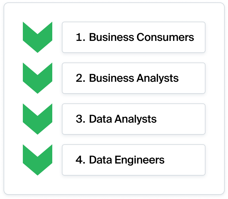 Stellen wir uns die Frage: Für wen im Unternehmen wollen wir Self-Service-Analysen bereitstellen? Aus der BI-Perspektive betrachtet, gibt es in einer typischen Organisation vier verschiedene Gruppen - Geschäftskunden, Geschäftsanalysten, Datenanalysten und Dateningenieure. Ihr Unternehmen kann eine andere Struktur haben, z.B. können Geschäftsanalysten und Datenanalysten dieselbe Gruppe sein, oder Geschäftskunden können in einigen Teams analytisch versierte Geschäftsanalysten sein, aber die unten beschriebenen Konzepte gelten trotzdem.