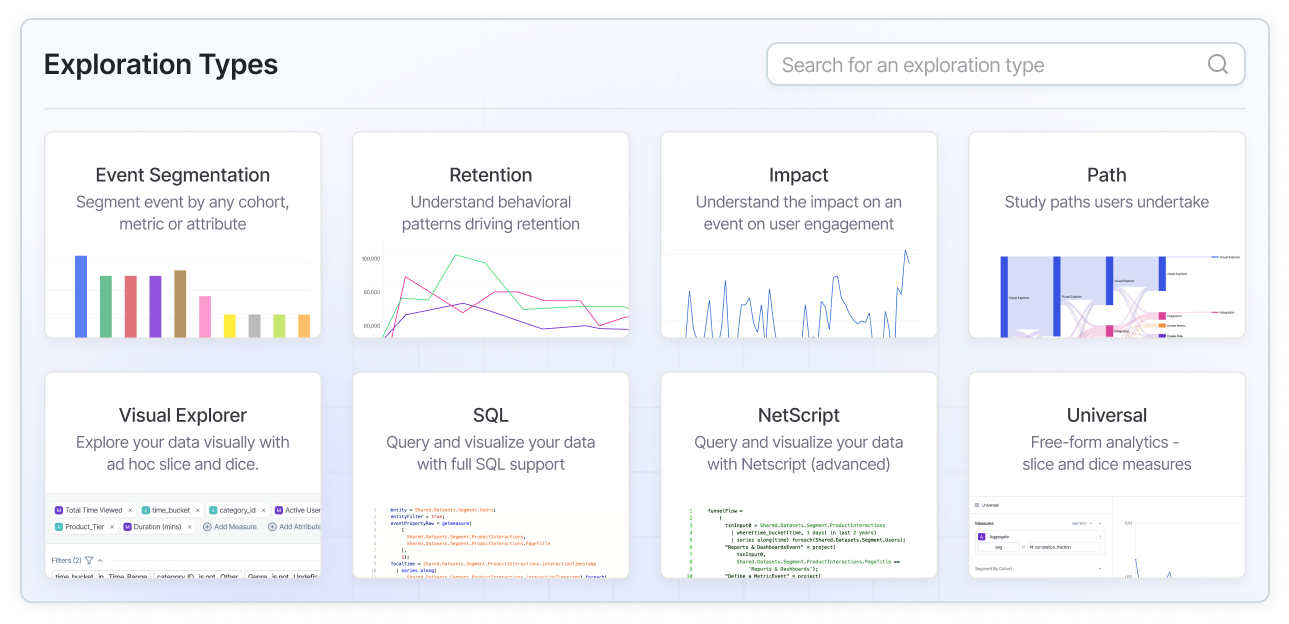 Optimizely Warehouse-Native Analytics bietet eine umfangreiche Bibliothek von UI-gesteuerten Vorlagen für generische Grundbausteine, anwendungsfallspezifische und domänenspezifische Analysen. Zu den grundlegenden Bausteinvorlagen gehören die Modellierung von Geschäftseinheiten, Ereignisströmen, Metriken, abgeleiteten/formelspezifischen Spalten und Kohorten. Zu den übergeordneten anwendungsfallspezifischen Vorlagen gehören Ereignis-Segmentierung, Trichter, Pfad, Auswirkung, Retention, Korrelation, Treiber und eine generische Vorlage "Universal Exploration". Die domänenspezifischen Vorlagen sind pro Domäne und Kunde anpassbar, z.B. Kampagneneffektivität, Feature Adoption, Produkt-KPI, Session Engagement, Sales Funnel, Website-Besucher usw. Vorlagen können Hand in Hand mit generativer KI arbeiten, wobei ein LLM-gesteuerter "Analyse-Co-Pilot" den Nutzern bei der Erstellung mit Vorlagen hilft.