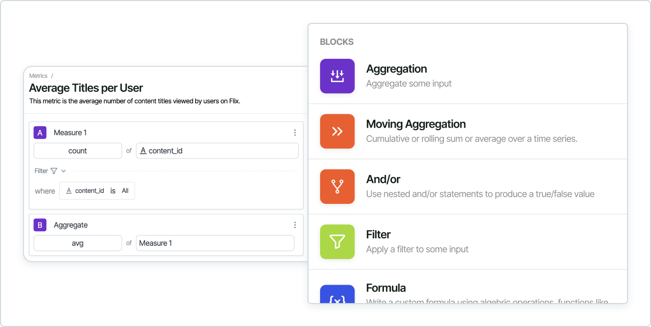 Optimizely Warehouse-Native Analytics bietet eine reichhaltige Bibliothek von Bausteinen, mit denen Sie beliebige analytische Berechnungen beliebiger Komplexität zusammenstellen können. Blöcke bieten den Vorteil, dass sie UI-gesteuert sind und kein SQL geschrieben werden muss - das macht sie für Business-Analysten nutzbar und erspart Datenanalysten mühsames SQL. Blöcke haben außerdem den Vorteil, dass sie modular und wiederverwendbar sind. Dadurch wird vermieden, dass viele verschiedene Definitionen desselben Sachverhalts in Tausenden von SQL-Anweisungen vergraben werden. Benutzer können Blöcke erstellen und veröffentlichen, die unabhängig voneinander, aber auch innerhalb anderer Blöcke für die nächste Berechnungsebene verwendet werden können. Blöcke erzeugen eine Zwischendarstellung in einer Sprache namens NetScript, die zu optimiertem SQL für verschiedene Data Warehouses kompiliert wird.