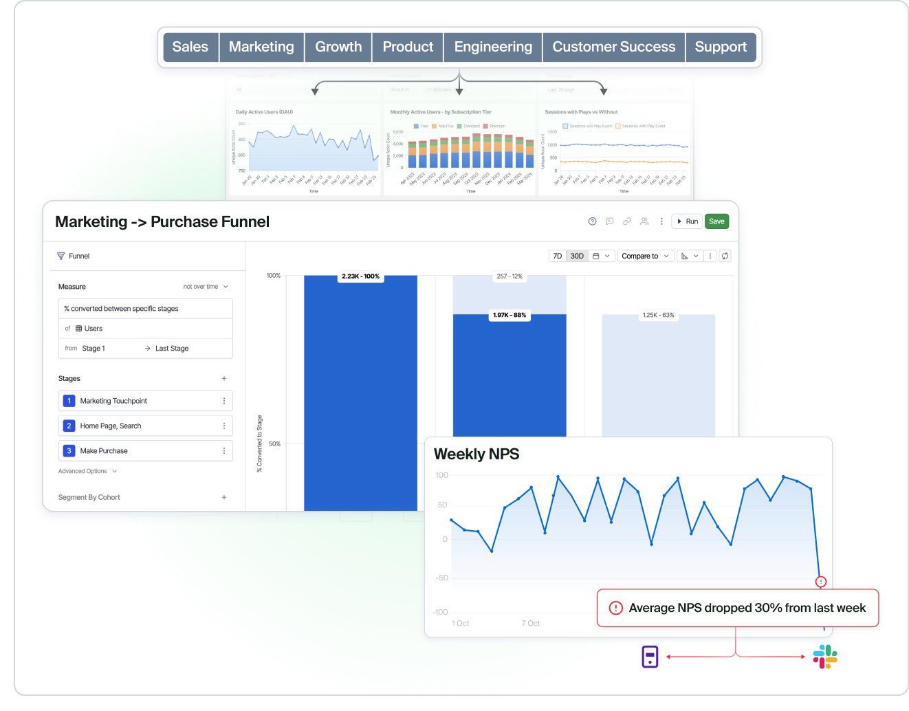 Wenn Geschäftskunden komplexere Ad-hoc-Fragen haben, die nicht über Dashboards beantwortet werden können oder die für eine natürlichsprachliche Schnittstelle zu komplex sind, wenden sie sich an Geschäftsanalysten. Zum Beispiel: "Analysieren Sie, warum die Conversion Rates im letzten Quartal gesunken sind". Diese Art von Fragen erfordern oft eine tiefgreifende und iterative Analyse, um Antworten zu erhalten. Oft haben diese Fragen mehrere Antworten. Das Ergebnis dieser Analyse ist eine Reihe von Untersuchungen und Kommentaren zu den Analyseschritten, die zu den Schlussfolgerungen führen. Genau hier liegt die größte Herausforderung bei der Selbstbedienung. Die überwiegende Mehrheit der Unternehmensanalysten kann nur einen Teil davon selbst durchführen (insbesondere mit Hilfe von LLMs), muss sich aber größtenteils auf Datenanalysten verlassen. Das liegt daran, dass die BI-Tools (wenn sie überhaupt Zugang zu ihnen haben) zu komplex und nicht für die Selbstbedienung ausgelegt sind.
