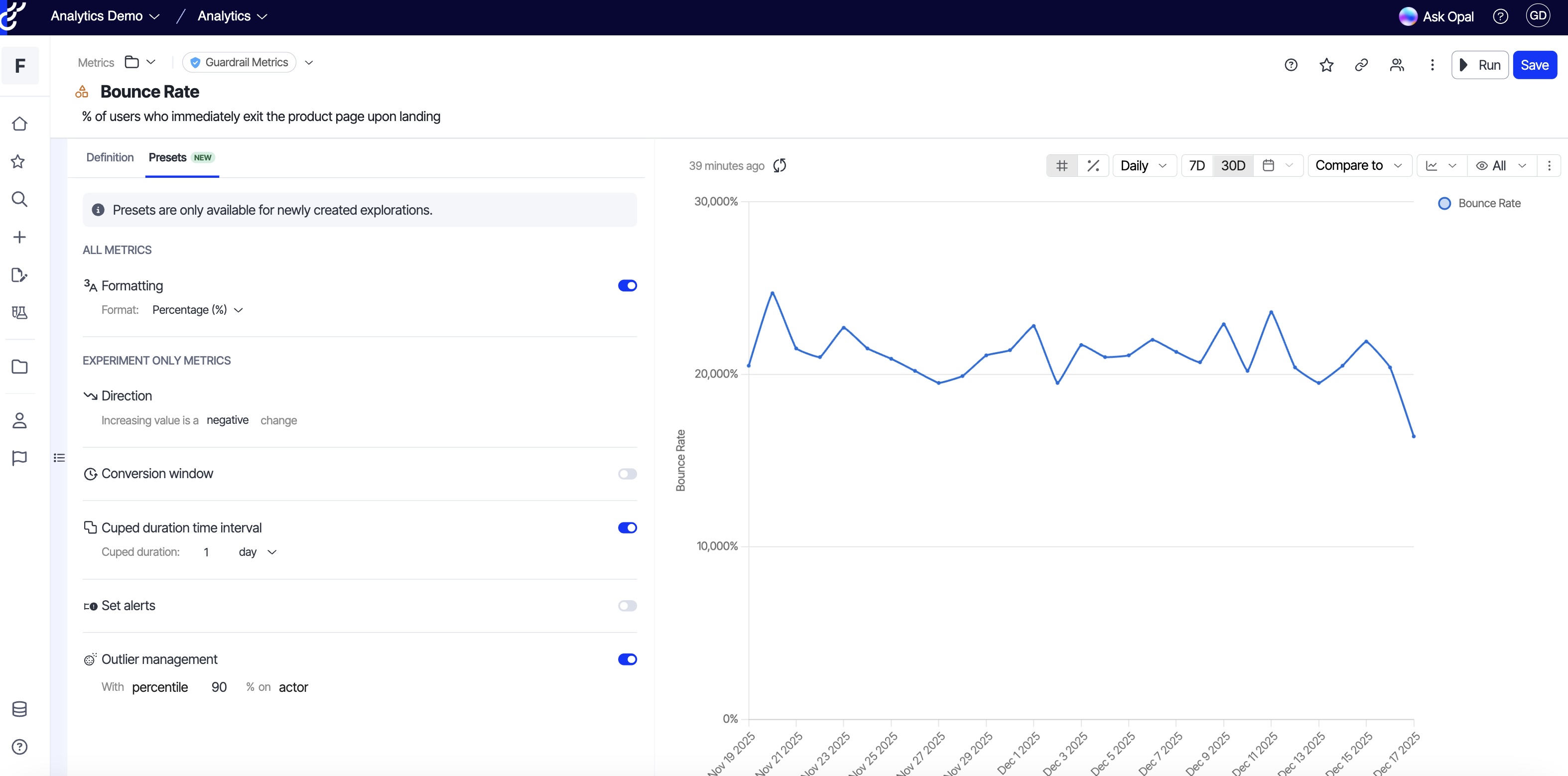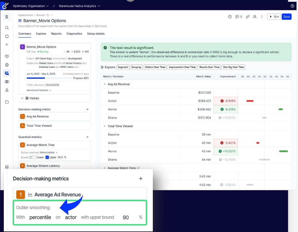 Die Ausreißerglättung hilft, durch Ausreißer verursachte verzerrte Ergebnisse von Experimenten zu vermeiden. Diese Funktion, die derzeit für Umsatzmetriken in Experimentieren verfügbar ist, wird auf alle numerischen Metriken in Analytics ausgeweitet. Sie können die Werte entweder auf einen bestimmten Schwellenwert begrenzen oder sie auf der Grundlage von Perzentilen glätten, um eine genauere Analyse zu gewährleisten.