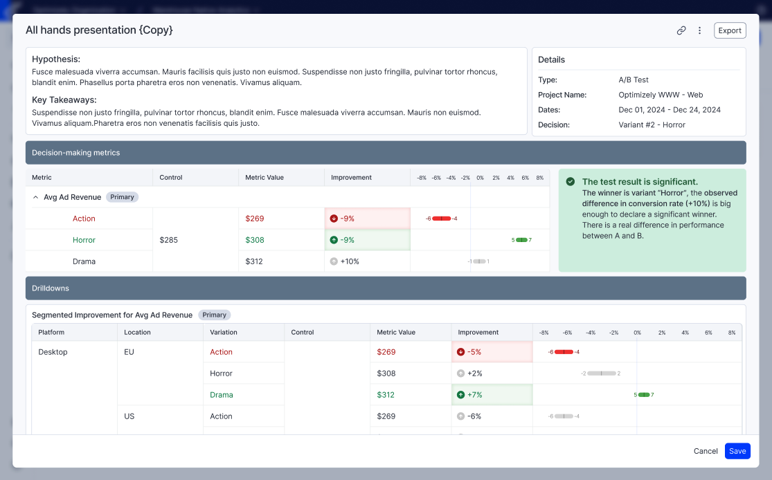 Speichern Sie die Ergebnisse von Experimenten, die gewonnenen Erkenntnisse und den Kontext als Berichte direkt in Optimizely Analytics. Exportieren Sie sie dann als PDF und/oder teilen Sie Live-Links - das verbessert die Transparenz und reduziert den manuellen Verwaltungsaufwand.