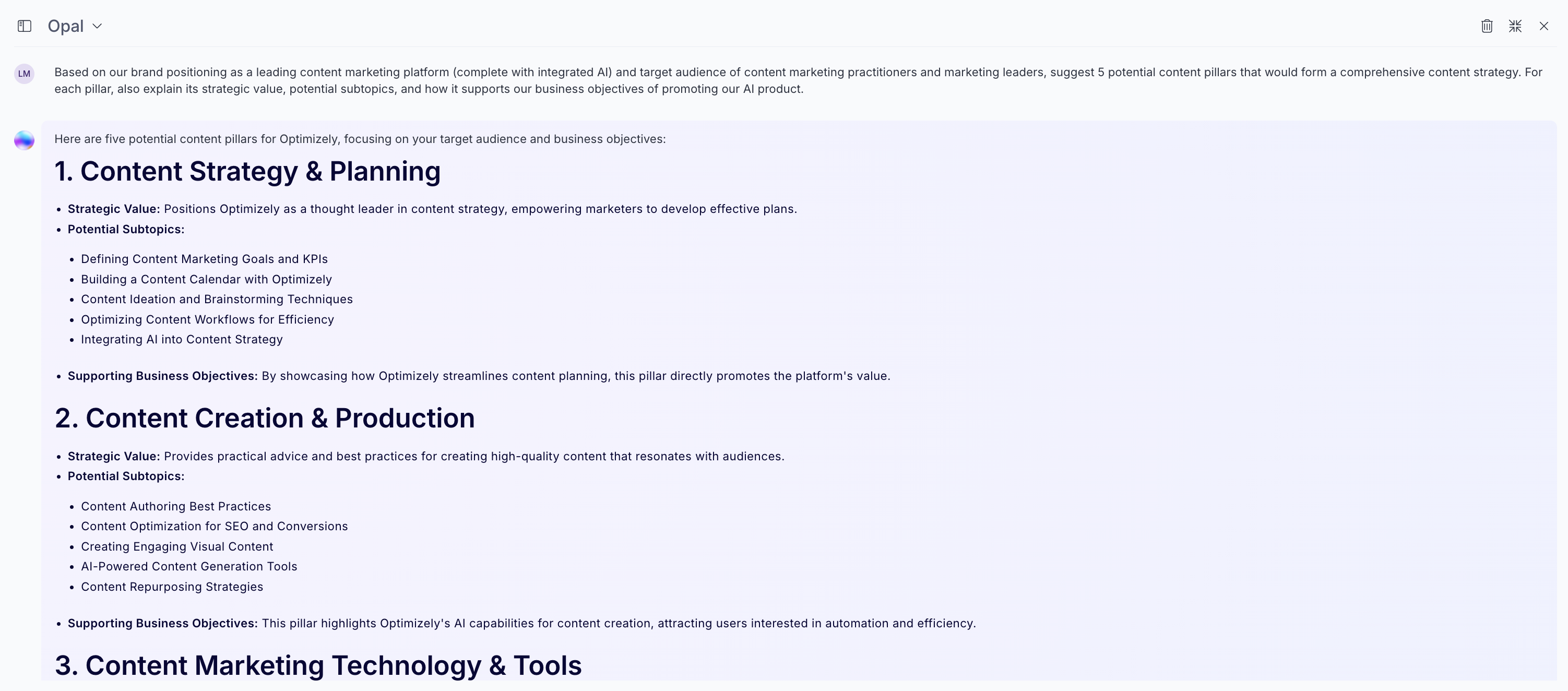 - Use a tool that is automatically enriched with your company data and brand guidelines: AI tools like Optimizely Opal make it easy for content marketers to use AI throughout the content lifecycle, from ideation and planning through to optimization and reporting, because they learn and follow your brand information and guidelines.