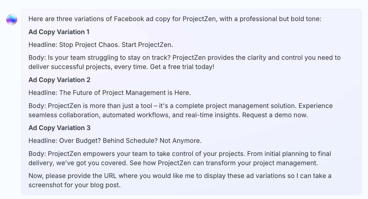 Example prompt: "Generate three variations of Facebook ad copy for a B2B SaaS product with a professional but bold tone"