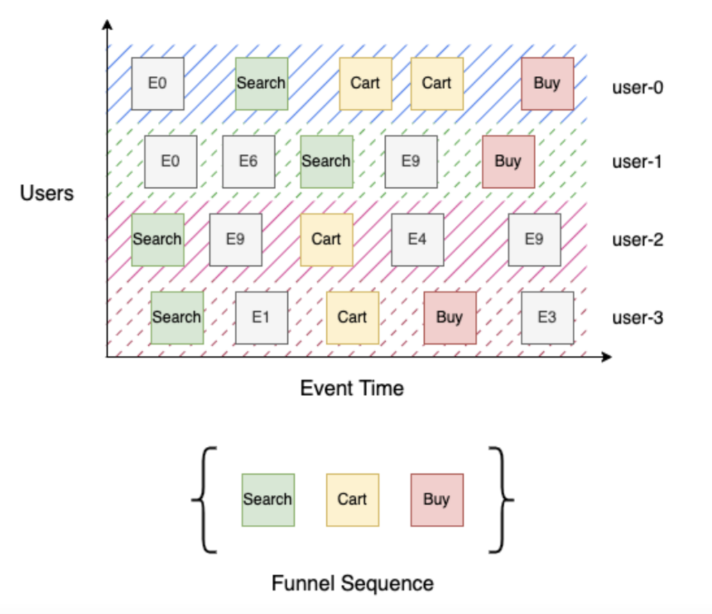 Let us consider a simple 3-stage buying funnel with stages - Search, Cart, and Buy. Search (stage 1) identifies all users that searched for the product, Cart (stage 2) identifies all users that searched for a product and added it to the cart, and finally, Buy (stage 3) identifies all users that searched for a product, added it to their cart, and checked out. Building this funnel is straightforward given a sorted stream of user events by event time - for each user, iterate through the sequence of events to track their progress through the funnel, then aggregate distinct users by stage. In the example above, “user-0” & “user-3” made it to Buy (stage 3), and “user-1” reached Search (stage 1) since there is no cart event in their event stream, and “user-2” reached Cart (stage 2).