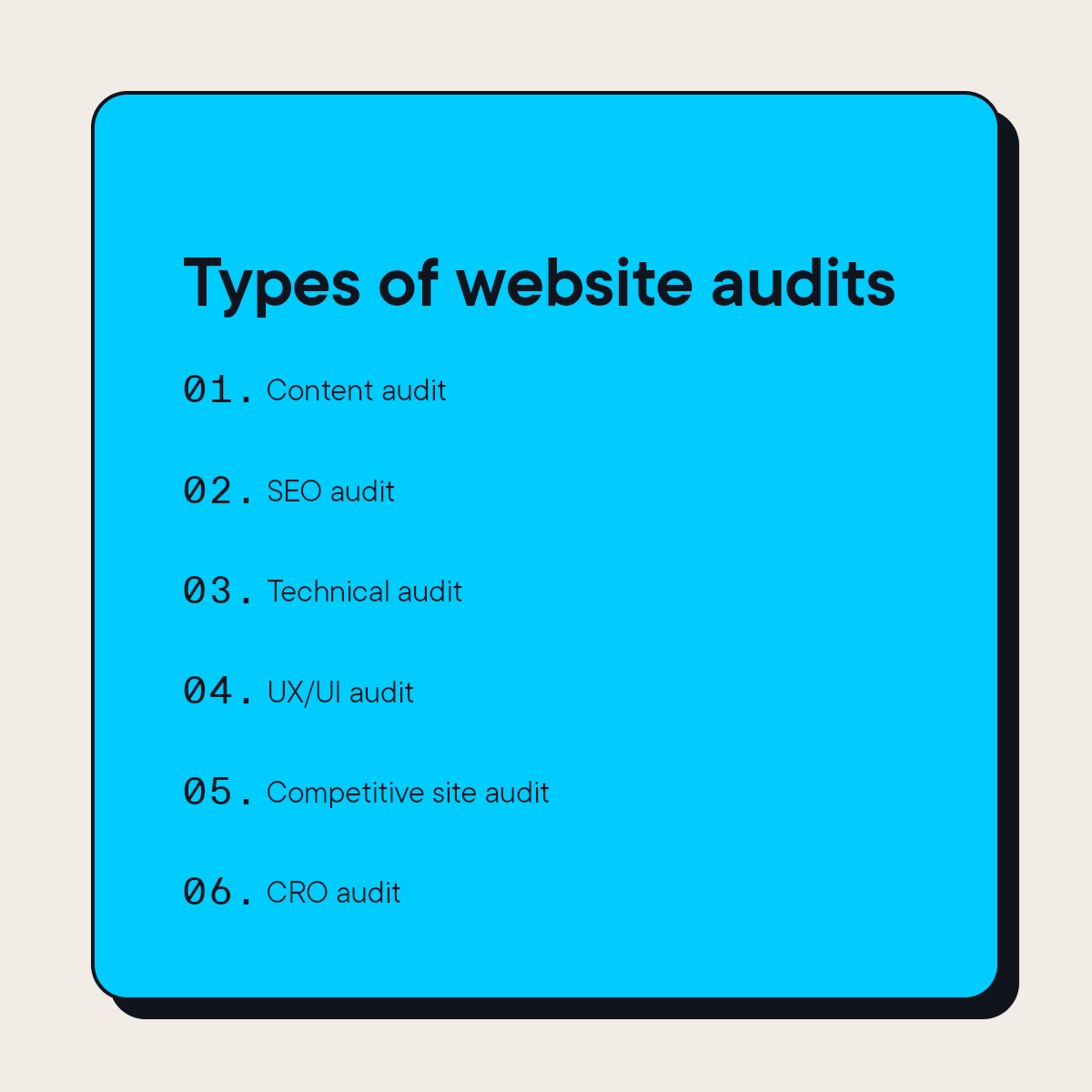 - UX/UI audit: User experience (UX) audits look at how users interact with your website. Using data from heatmaps and session recordings, a UX audit can help you pinpoint usability issues, friction points, and design flaws that frustrate users and have a knock-on effect on your site engagement and retention.
