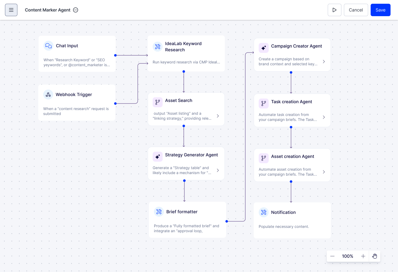 This agent will carry out keyword research and create multiple assets (a content cluster) to dominate search results. It's your own little workforce: a handful of specialized agents completing a workflow to get the job done.​